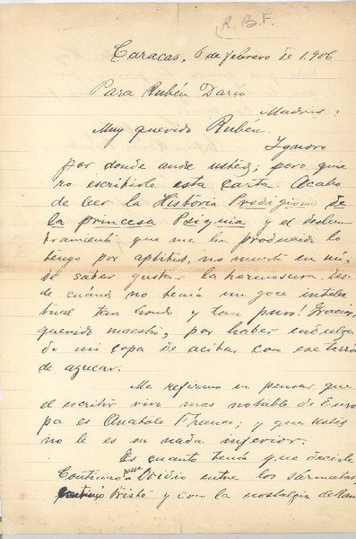 [Carta] [entre 1900 y 1910] Caracas?, Venezuela [a] Rubén Darío [manuscrito] Rufino Blanco-Fombona.