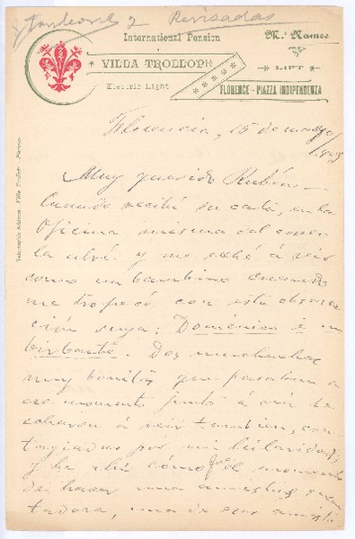 [Carta] 1903 mayo 15, Florencia, Italia [a] Rubén Darío [manuscrito] Rufino Blanco-Fombona.