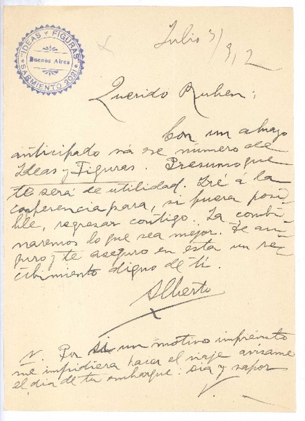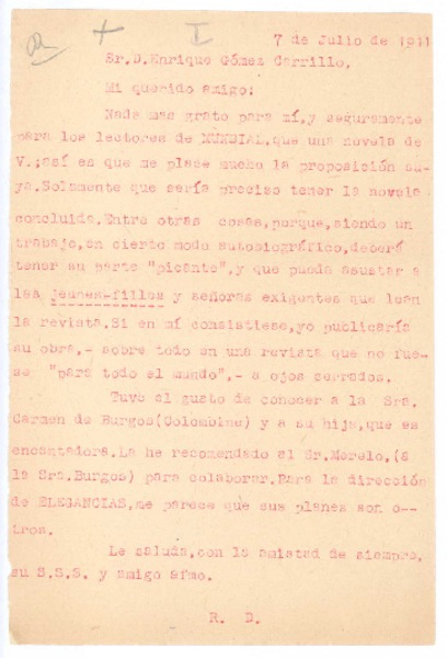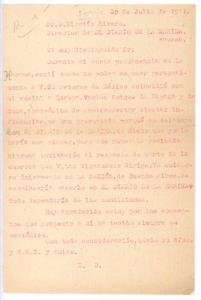 [Carta] 1912 julio 3, Buenos Aires, Argentina [a] Rubén Darío [manuscrito] Alberto Ghiraldo.