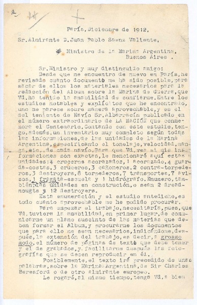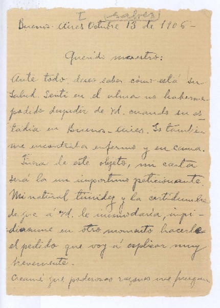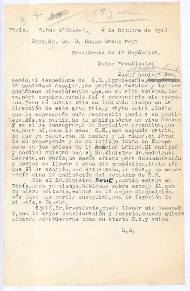 [Carta] 1912 oct. 12, París, Francia [a] Roque Sáenz Peña [manuscrito] Rubén Darío.
