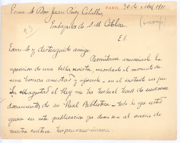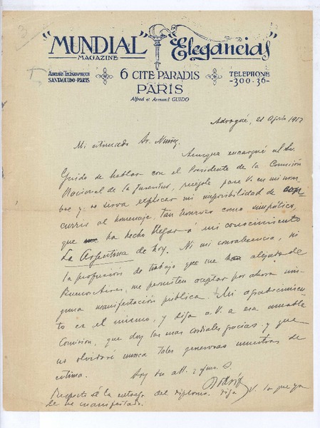 [Carta] 1917 abril 18, Paris, Francia [a] Juan Gualberto Lopez-Valdemoro y de Quesada, Conde de las Navas [manuscrito] Rubén Darío.
