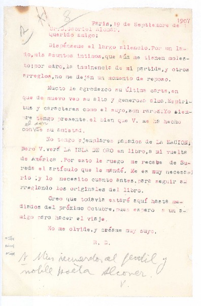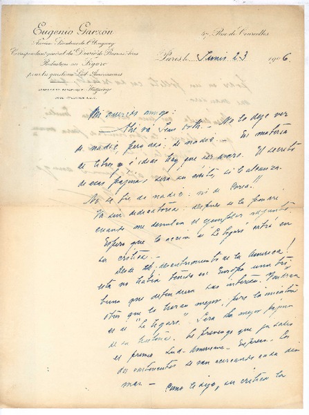 [Carta], 1913 jun. 23 Paris, Francia <a> Rubén Darío [manuscrito] Nicolás, Salmerón y García.