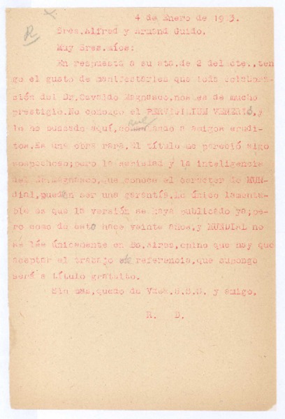 [Carta] 1913 ene. 4, Paris, Francia [a] Alfredo Guido y Armando Guido [manuscrito] Rubén Darío.