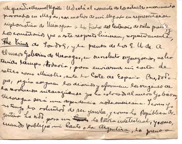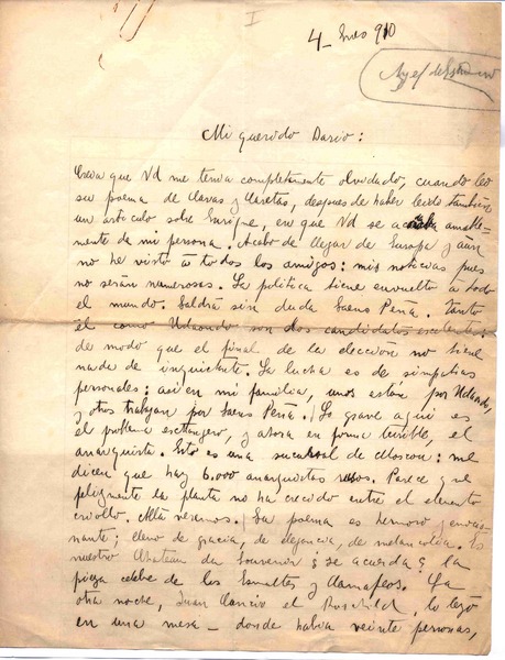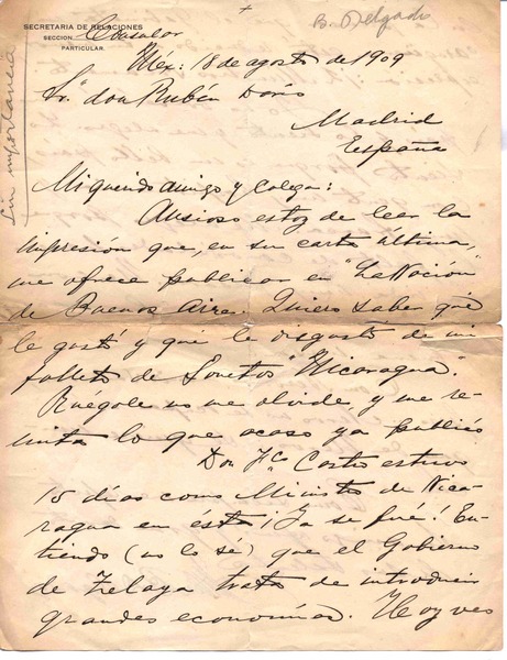 [Carta], c.1910 Argentina <a> José Santos Zelaya [manuscrito] Rubén Darío.