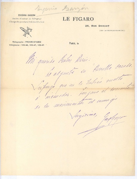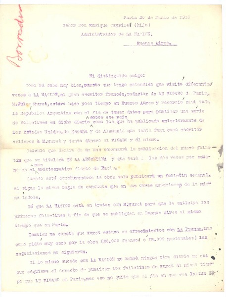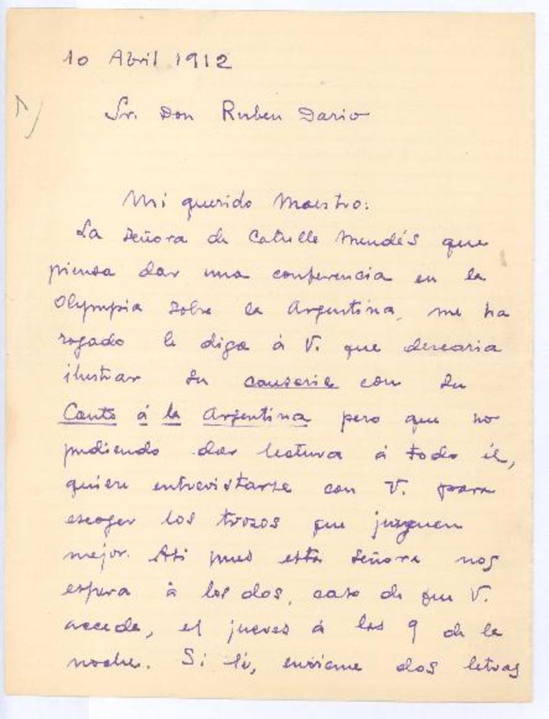 [Carta], c. 1906 Buenos Aires, Argentina <a> Rubén Darío [manuscrito] Lugné Poe.
