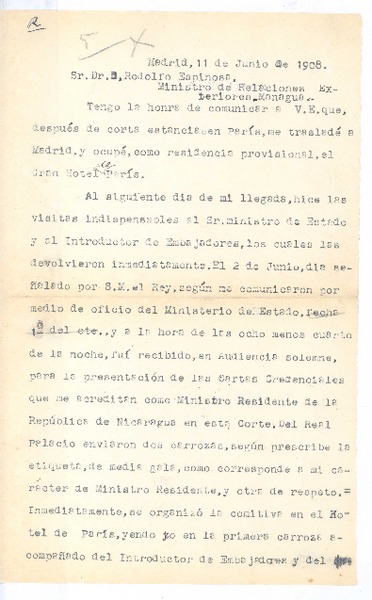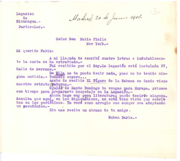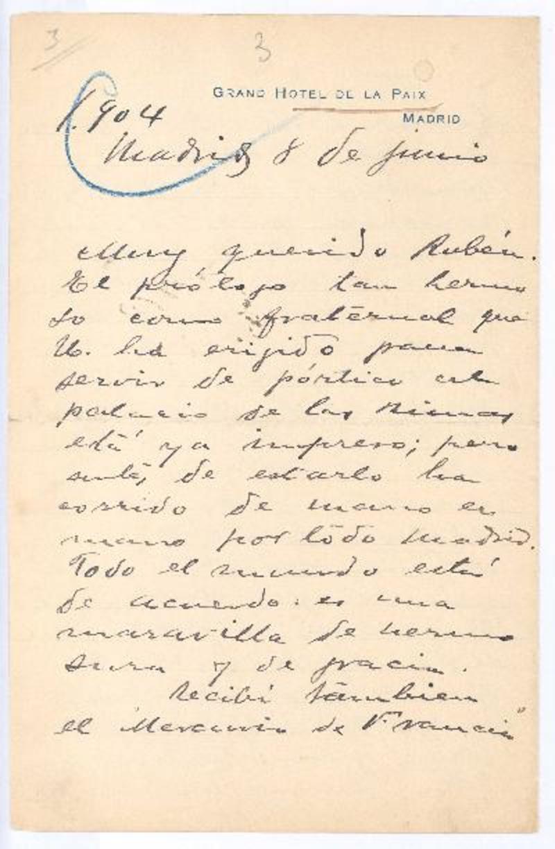 [Carta] 1904 jun. 8, Madrid, España [a] Rubén Darío [manuscrito] Rufino Blanco-Fombona.