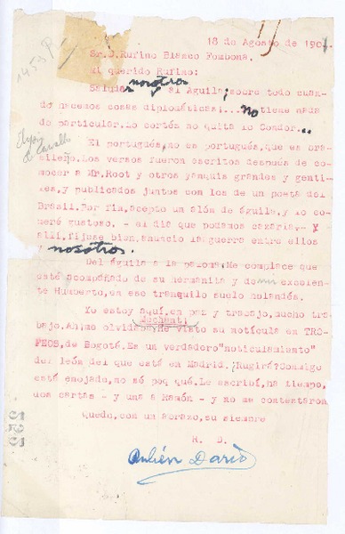 [Carta], 1904 ago. 11 Madrid, España <a> Rubén Darío [manuscrito] José María Vargas Vila.