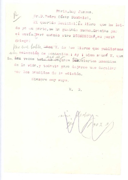 [Carta] 1902? Paris, Francia [a] Pedro César Dominici [manuscrito] Rubén Darío.