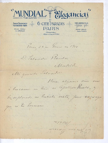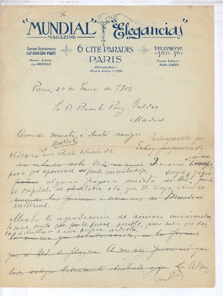 [Carta] 1912 enero 26, Paris, Francia [a] Salvador Rueda [manuscrito] Rubén Darío.