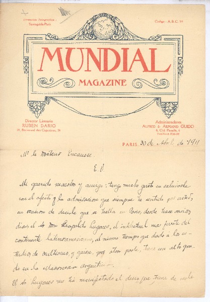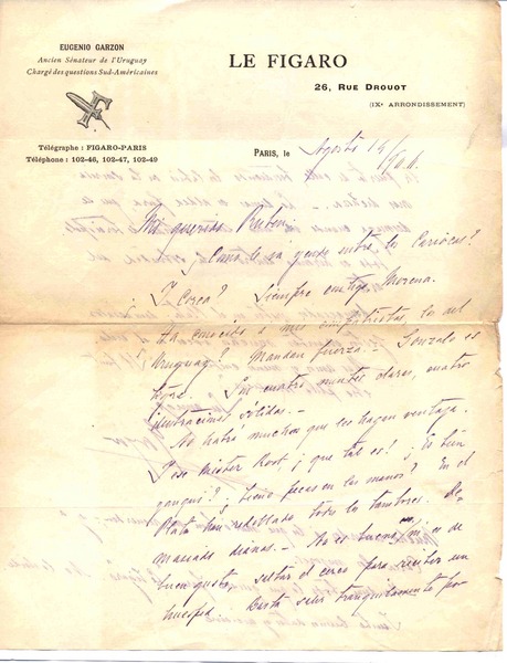 [Carta], c.1900 Paris, Francia <a> Rubén Darío [manuscrito] Armando Guido.