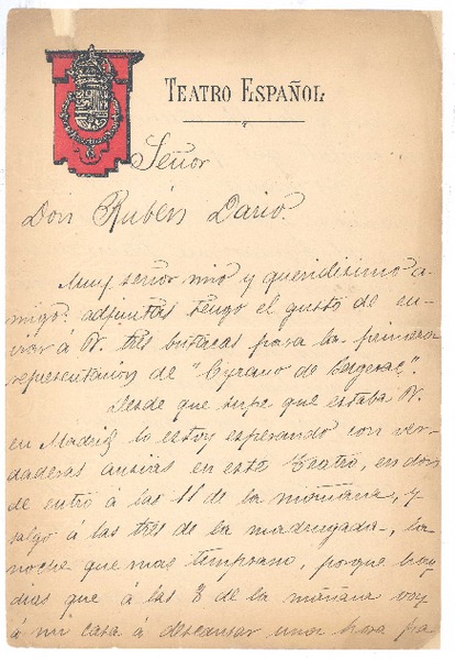 Benavente, Jacinto - Correspondencia - Autores españoles - Darío, Rubén - Manuscritos españoles - Poetas nicaragüenses
