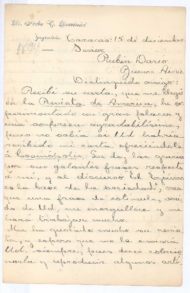 [Carta] 1894 diciembre 15, Caracas, Venezuela [a] Rubén Darío [manuscrito] Pedro César Dominici.