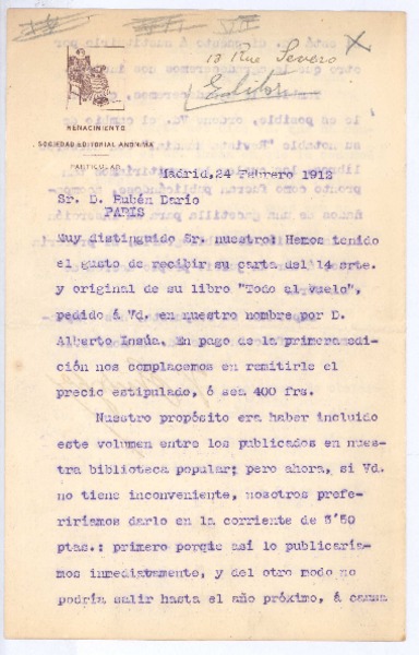 [Carta] 1912 febrero 24, Madrid, España [a] Rubén Darío [manuscrito] J. Quiroga.