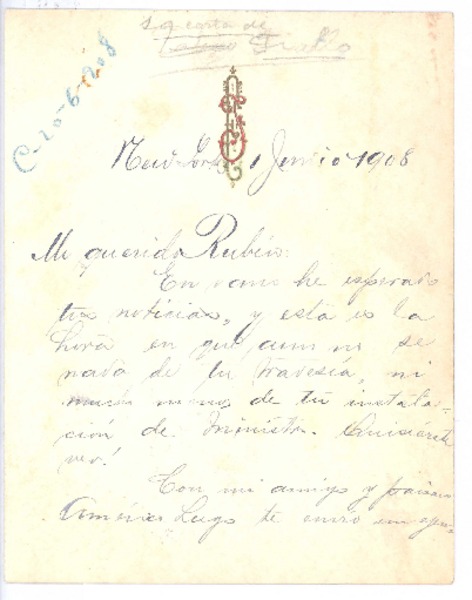 [Carta], 1904 jun. 1 Buenos Aires, Argentina <a> Rubén Darío [manuscrito] Ricardo Rojas.