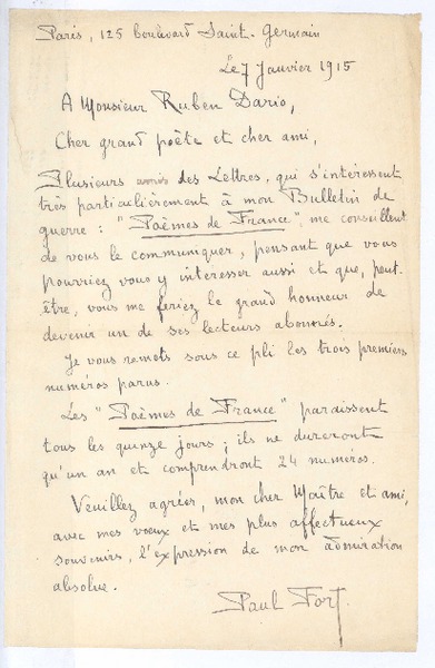 [Carta] 1915 enero 7, Paris, Francia [a] Rubén Darío [manuscrito] Paul Fort.