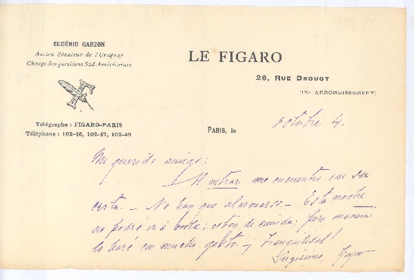 [Carta], c.1900 oct. 10 Paris, Francia <a> Rubén Darío [manuscrito] Enrique Gómez Carrillo.