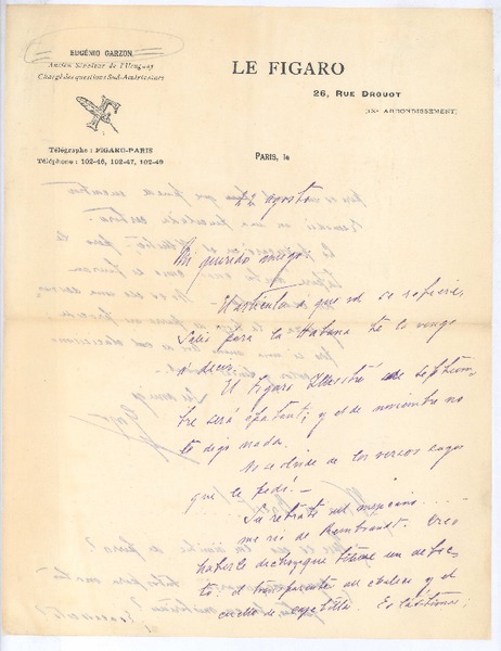 [Carta], 1896 Paris, Francia <a> Rubén Darío [manuscrito] Enrique Gómez Carrillo.