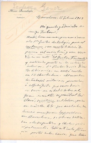 [Carta] 1913 febrero 15, Barcelona, España [a] Rubén Darío [manuscrito] Pompeyo Gener.
