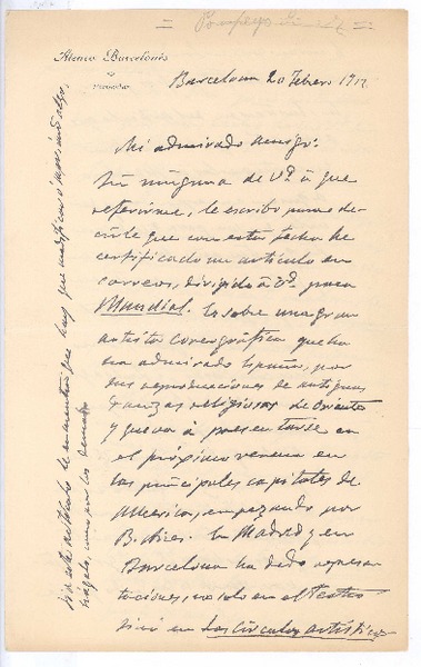 [Carta] 1912 febrero 20, Barcelona, España [a] Rubén Darío [manuscrito] Pompeyo Gener.