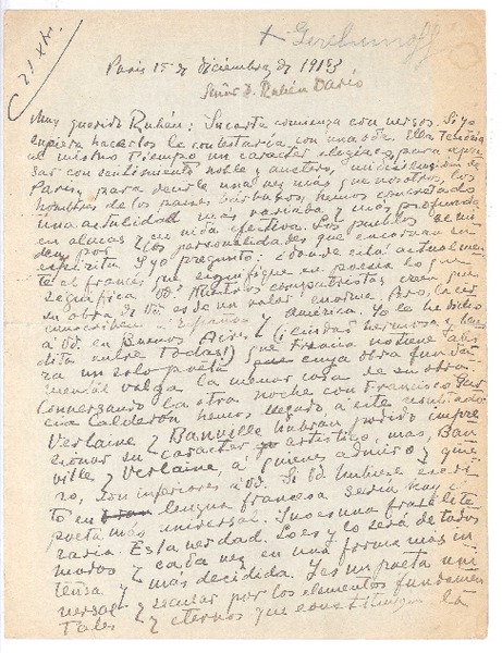 [Carta] 1913 diciembre 15, Paris, Francia [a] Rubén Darío [manuscrito] Alberto Gerchunoff.