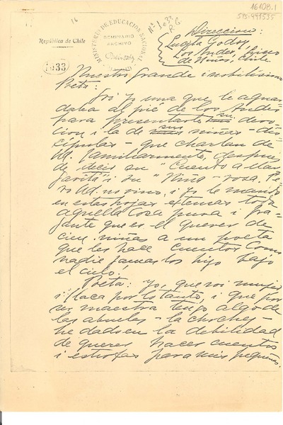 [Carta] 1913 , Los Andes, Chile [a] [Ruben Darío] [manuscrito] Lucila Godoy.