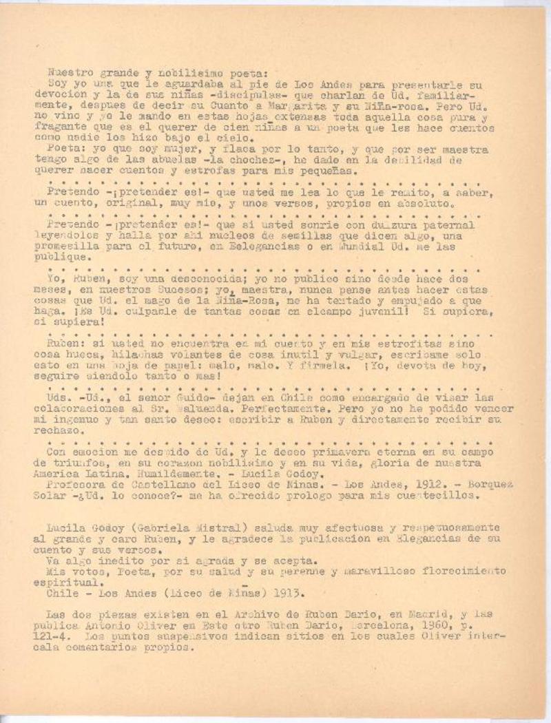 [Carta 1912 o 1913], Los Andes, Chile <a> Rubén Dario [manuscrito] Gabriela Mistral ; transcripción de Raúl Silva Castro.