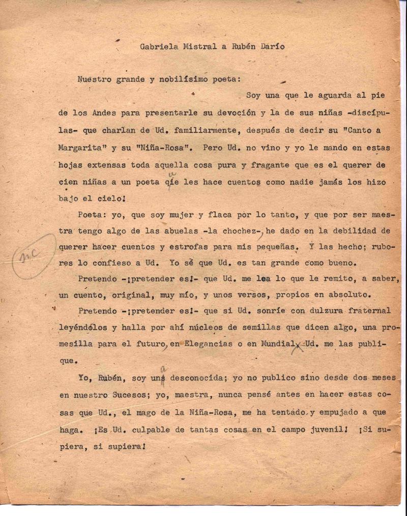 Correspondencia - Manuscritos chilenos - Darío, Rubén - Mistral, Gabriela - Poetas nicaragüenses - Poetisas chilenas