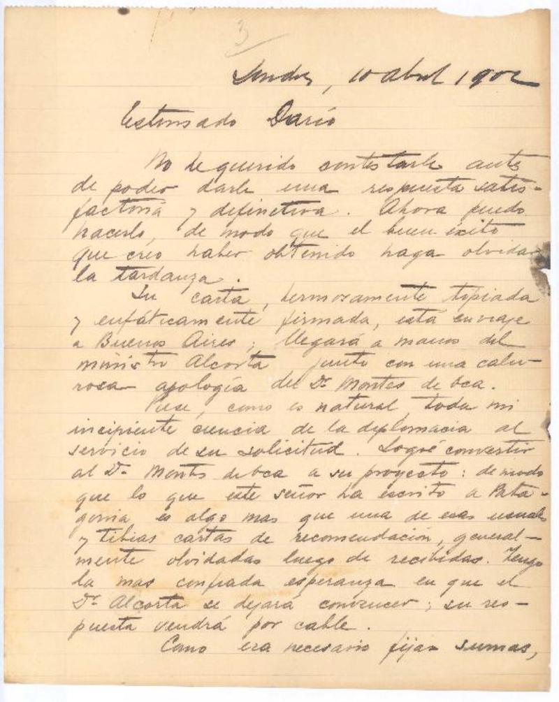 [Carta] 1902 abr. 10, Londres, Inglaterra [a] Rubén Darío [manuscrito] Carlos Alfredo Becu.