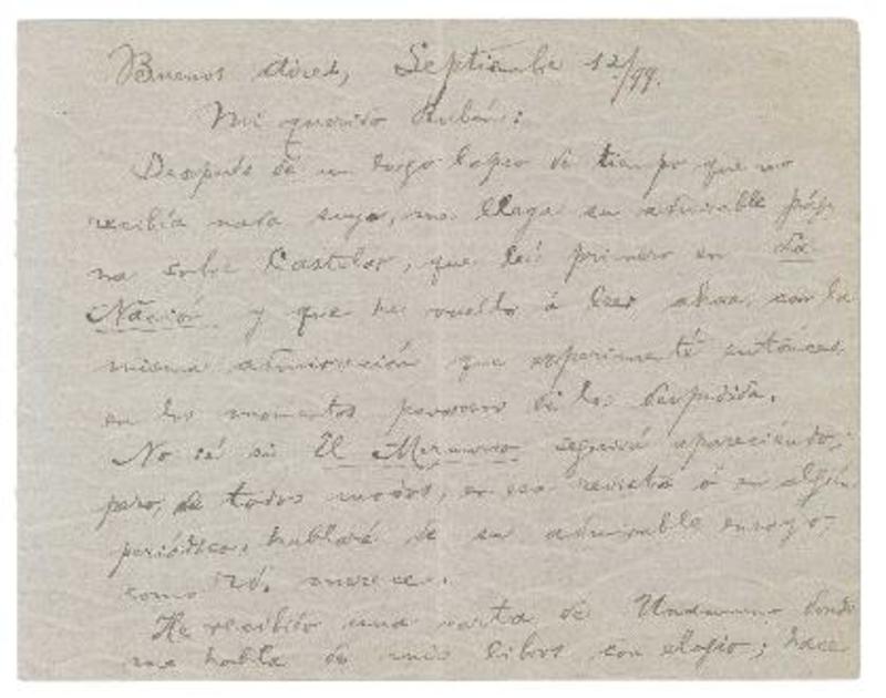 [Carta] 1899 sep. 12, Buenos Aires, Argentina [a] Rubén Darío [manuscrito] Luis Berisso.