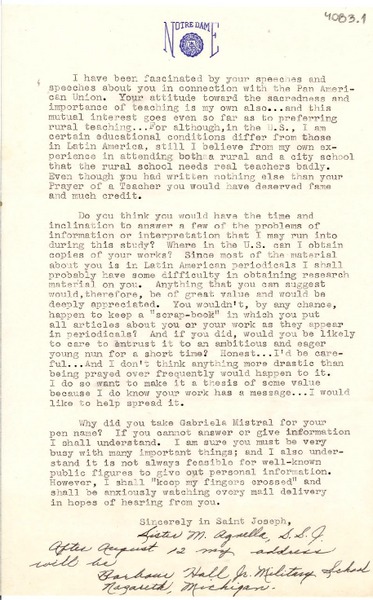 [Carta] 1949 ago. 3, Nazareth, Michigan, [EE.UU.] [a] Gabriela [Mistral], Santa Bárbara, California, [EE.UU.] [manuscrito] Sister M. Agnella.