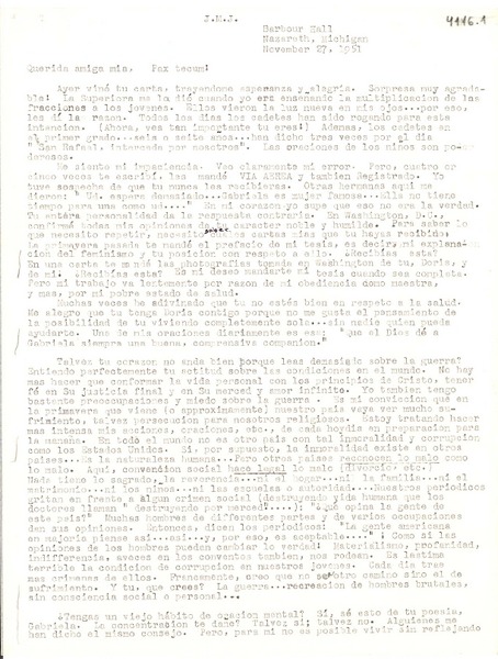 [Carta] 1951 nov. 27, Nazareth, Michigan, [EE.UU.] [a] Gabriela [Mistral] [manuscrito] M. Agnella, S.S.J.