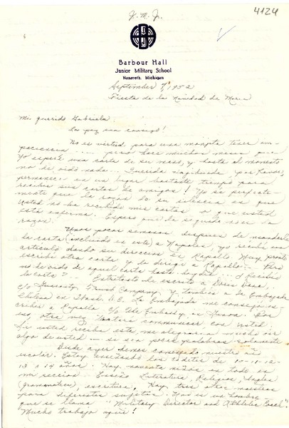 [Carta] 1952 sept. 7, Nazareth, Michigan, [EE.UU.] [a] Gabriela [Mistral] [manuscrito] Sister M. Agnella.