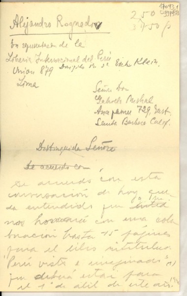 [Carta] Lima [a] Gabriela Mistral, Santa Barbara, Calif. [manuscrito] Alejandro Rognedov.