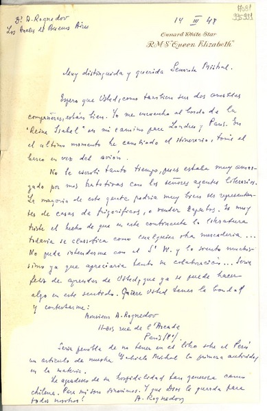 [Carta] 1948 mar. 14 [a] Muy distinguida y querida señorita Mistral [manuscrito] Monsieur A. Rognedov.