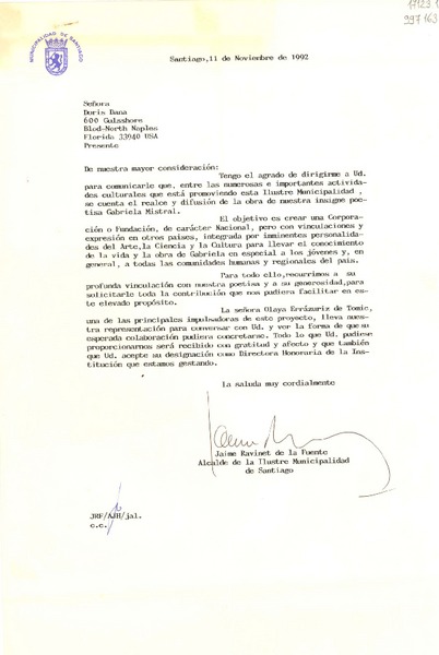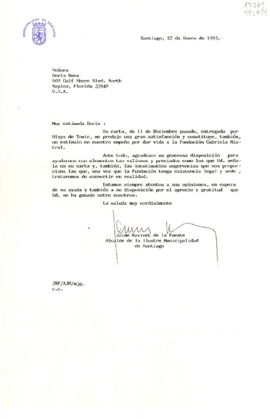 [Carta] 1993 ene. 27, Santiago, [Chile] [a la] Señora Doris Dana, 600 Gulf Shore, Blvd. North Naples, Florida 33940, U.S.A [manuscrito] Jaime Ravinet de la Fuente, Alcalde de la Ilustre Municipalidad de Santiago.