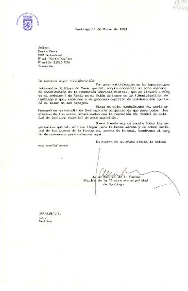 [Carta] 1993 mar. 11, Santiago, [Chile] [a la] Señora Doris Dana, 600 Gulfsshore, Blod - North Naples, Florida 33940, USA [manuscrito] Jaime Ravinet de la Fuente, Alcalde de la Ilustre Municipalidad de Santiago.