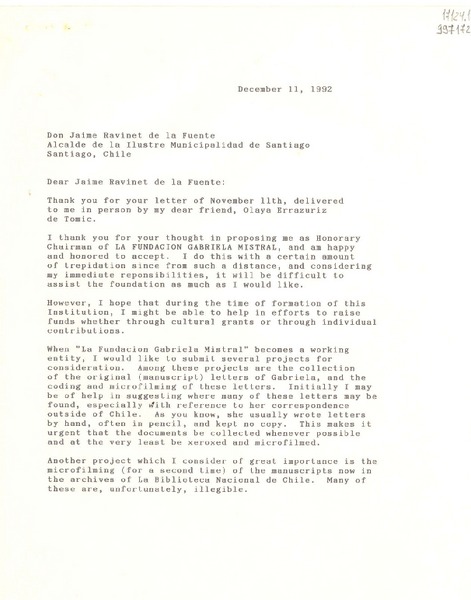 [Carta] 1992 Dec. 11, North Naples, Florida, [Estados Unidos] [a] Don Jaime Ravinet de la Fuente, Alcalde de la Ilustre Municipalidad de Santiago, Santiago, Chile [manuscrito] Doris Dana.