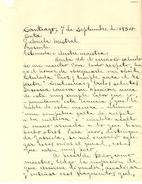 [Carta] 1954 sept. 7, Santiago [a] Gabriela Mistral [manuscrito] César Baeza Sandoval.