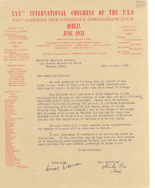 [Carta] 1953 Jan. 14, Dublin, [Irlanda] [a] Señorita Gabriela Mistral, Naples, Italy [manuscrito] President.