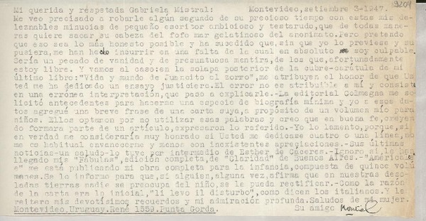 [Carta] 1947 sept. 3, Montevideo, [Uruguay] [a] Gabriela Mistral [manuscrito] Adolfo Montiel Ballesteros.