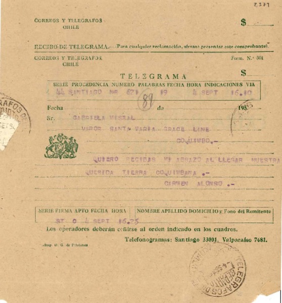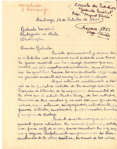 [Carta] 1954 oct. 12, Santiago [a] Gabriela Mistral, Washington [manuscrito] Carmen de Alonso.