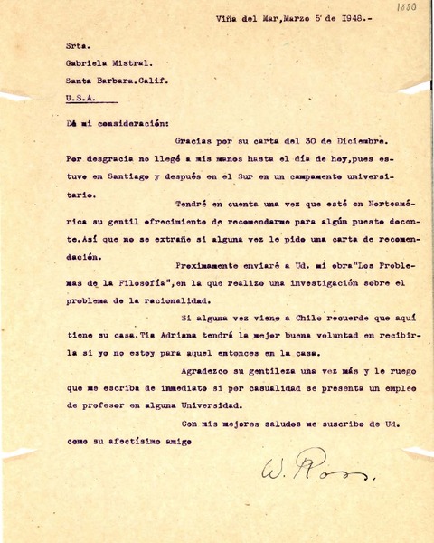 [Carta] 1948 mar. 5, Viña del Mar, Chile [a] Gabriela Mistral, Santa Barbara, Calif[ornia], EE.UU. [manuscrito] W[aldo] Ross.