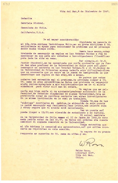 [Carta] 1947 dic. 8, Viña del Mar [a] Señorita Gabriela Mistral, Consulado de Chile, California, U. S. A. [manuscrito] Waldo Ross.