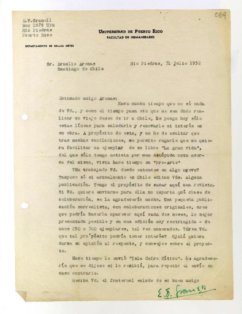 Puerto Rico, Venezuela, New York y Chile [a] Braulio Arenas Cartas, 31 de julio de 1952 y entre 1969 y 1985, [manuscrito] Varios autores.