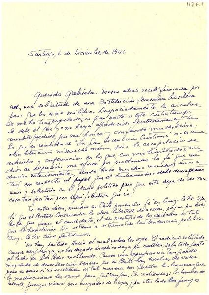 [Carta] 1941 dic. 6, Santiago [a] Gabriela Mistral [manuscrito] Eulalia Puga de Benavente.