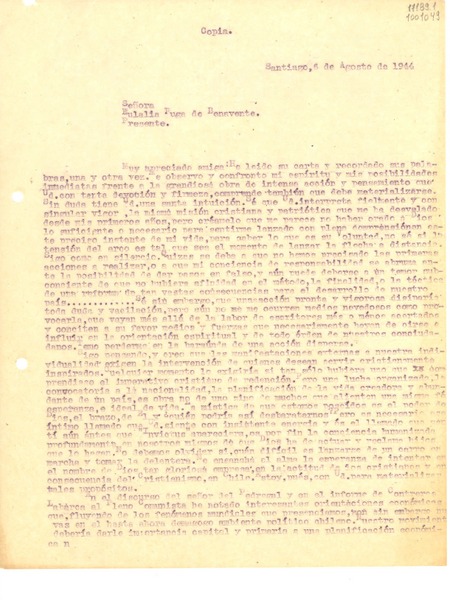 [Carta] 1944 ago. 6, Santiago, [Chile] [a] Eulalia Puga de Benavente [manuscrito] E. Araneda.