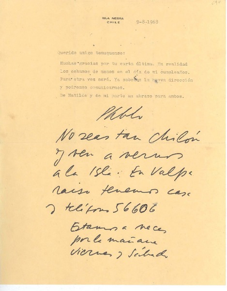[Carta] 1968 ago. 9, Isla Negra, Chile [a] Armando Benavente [manuscrito] Pablo Neruda.