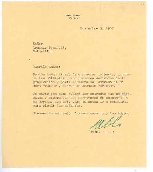 [Carta] 1967 nov. 3, Isla Negra, Chile [a] Armando Benavente [manuscrito] Pablo Neruda.