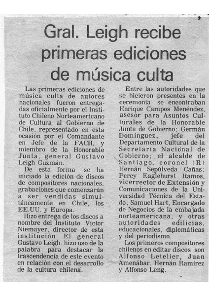 Gral. Leigh recibe primeras ediciones de música culta [artículo]