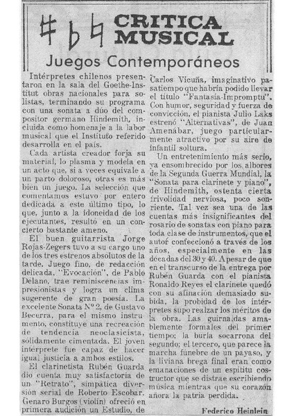 Crítica musical - Vicuña, Carlos - Evocación - Compositores - Escobar, Roberto - Delano, Pablo - Amenábar Ruiz, Juan Eduardo - Rojas-Zegers, Jorge - Guarda, Rubén - Reseña de conciertos - BECERRA-SCHMIDT, GUSTAVO - CRITICA E INTERPRETACION - Burgos, Genaro - Lacks, Julio - Reyes, Ronaldo